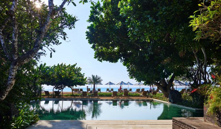 close to Bali’s major tourist attractions. At the hotel you can enjoy three restaurants, three swimming pools, 500 metres of beach front and spa facilities.
